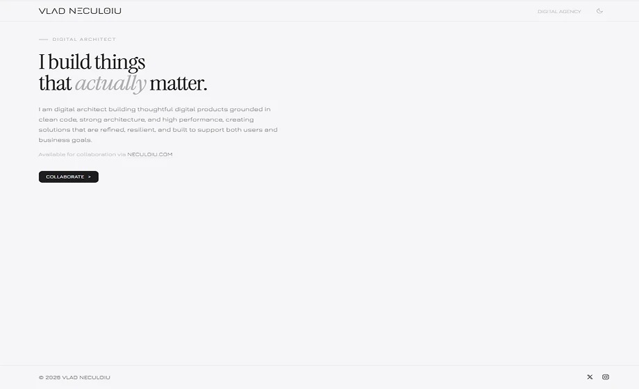 A minimalist personal landing page with light and dark themes, distilled to a name, a role, and one way to get in touch.